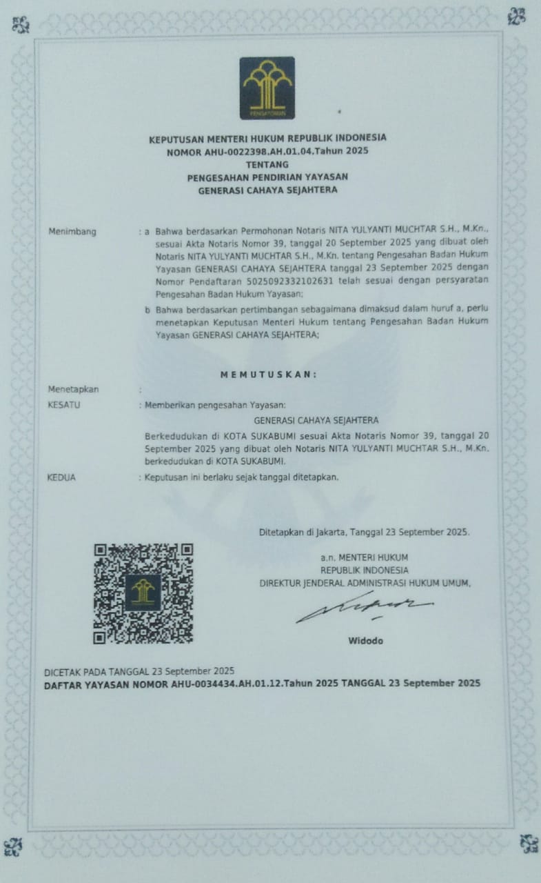 Sebagai wujud komitmen jangka panjang dan untuk memastikan legalitas, lembaga ini secara resmi berbadan hukum berupa Yayasan GENERASI CAHAYA SEJAHTERA, yang disahkan oleh Kemenkumham pada tanggal 20 September 2025.